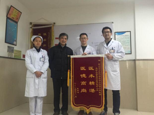 2015年11月30日患者張大爺將一面寫著“醫(yī)德高尚 醫(yī)術(shù)精湛”字樣的錦旗親手送到針灸康復(fù)科賴春柏主任手上。感謝賴春柏主任、謝豐蔚醫(yī)生、李元金護(hù)士長(zhǎng)、責(zé)任護(hù)士藍(lán)善慧及科室全體醫(yī)護(hù)人員在其住院期間給予的無微不至的關(guān)心和照顧。